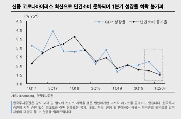 이미지 확대보기1일 권희진·김예인 한국투자증권 연구원은 “가계소비는 기존 전망치보다 위축돼 GDP 성장률을 끌어내릴 것으로 보인다”면서 ”올해 1분기 국내 성장률은 전년동기대비 1.6%, 가계소비 증가율은 1.5%에 그칠 것”이라고 전망했다.