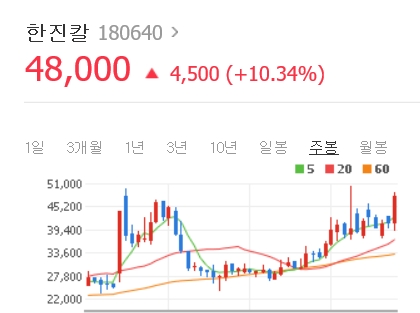 한진칼 주가는 전날 10% 올라 4만 8000원에 거래를 마쳤다.