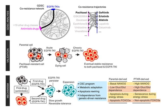 연구팀은 폐암 세포가 화학 요법 약물 중 하나인 파크리탁셀에 대한 내성을 가지는 과정에서 표적 치료제인 EGFR-TKI에도 교차저항을 갖는 현상을 발견했다. 1차 약물에 대한 적응과정에서 암세포가 줄기세포화 해 전혀 다른 표적 치료제인 2차 약물에 저항을 가진다는 현상을 확인했다.