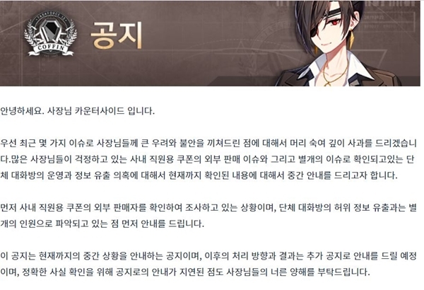 이미지 확대보기19일 넥슨은 카운터사이드 공식 웹페이지 공지사항을 통해 "최근 몇 가지 이슈로 사장님들께 큰 우려와 불안을 끼쳐드린 점에 대해서 머리 숙여 깊이 사과를 드린다"라면서 커뮤니티에서 논란이 된 직원용 쿠폰의 외부 판매 이슈와 관련된 단체 대화방 등 정보 유출 의혹에 대해 해명했다.