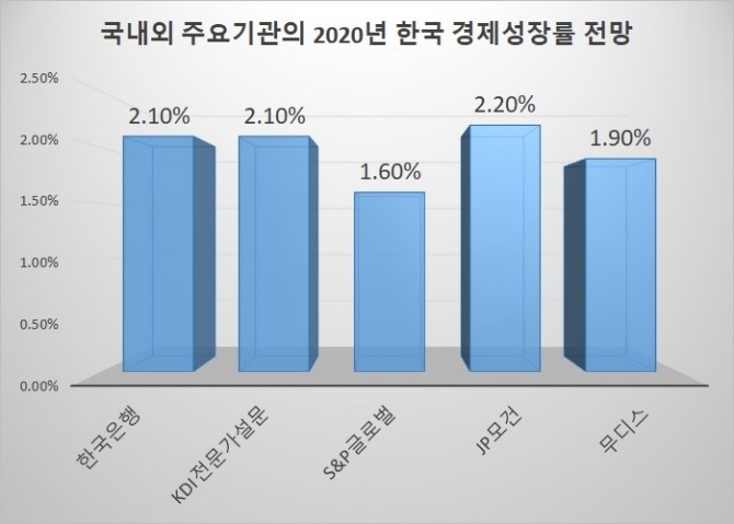 글로벌 투자은행(IB)과 경제연구소 등의 한국 경제성장률 전망은 한은 전망보다 더 낮게 나왔다. 스탠다드앤푸어스 글로벌 신용평가(S&P Global Ratings)는 한국의 2020년 성장률 전망치를 기존 2.1%에서 1.6%로 0.5%포인트 하향했다. 코로나19의 영향을 받아 인구이동 감소와 공급망 차질을 빚을 것이라는 이유다.