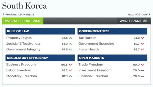 18일 미국 헤리티지 재단이 펴낸 '2020년 경제자유지수' 보고서에 따르면 우리나라는 조사대상 180개 국가 가운데 25위를 차지했다.