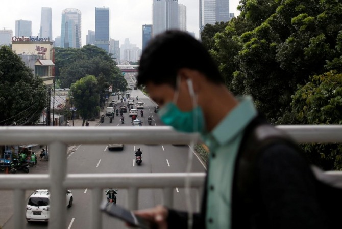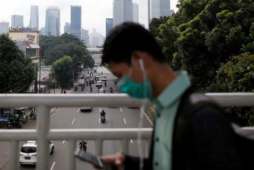 지난 13일(현지시간) 인도네시아 수도 자카르타에서 한 시민이 마스크를 착용한 채 육교를 건너고 있다. 사진=로이터