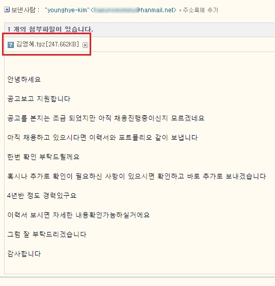 20일 안랩에 따르면 공격자는 메일 본문에는 ‘공고를 본 지는 조금 되었지만 지원한다’며 ‘이력서와 포트폴리오를 같이 보낸다’는 자연스러운 한글 메시지를 포함해 모집기간이 아닌 기업의 담당자도 악성 첨부파일을 열어보도록 유도하기 위한 것으로 추정된다.