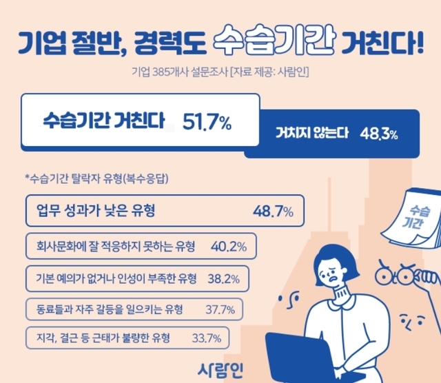 정식 채용 여부를 결정하는 주요 요인이 ‘업무 성과’인 만큼 수습기간 탈락 확률이 높은 유형 1위도 ‘업무 성과가 낮은 유형’(48.7%∙복수응답)이 차지했다.