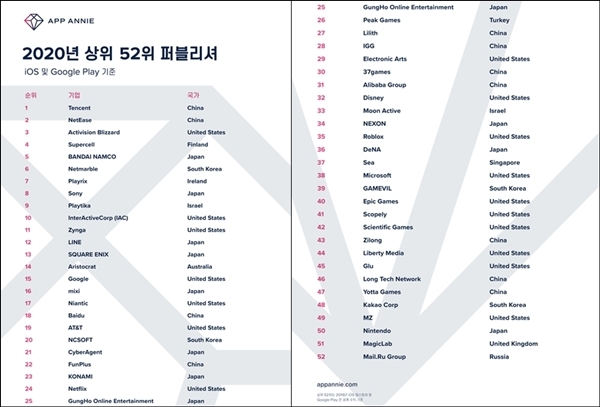 앱애니 2020 상위 앱 퍼블리셔 Top 52. 자료=앱애니이미지 확대보기