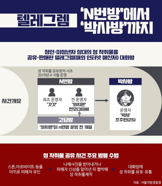 범행 수법은 스폰·아르바이트 등을 미끼로 피해자를 유인 후 나체사진을 받아내거나 피해자 신상을 알아낸 뒤 협박해 성 착취물을 제작한 후 대화방에 유포·유통했다.