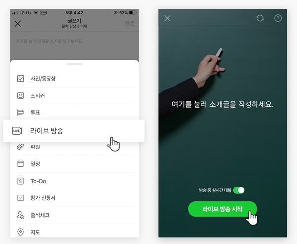 이미지 확대보기밴드 ‘라이브 방송’ 기능으로는 실시간 강의를 제공할 수 있다. 밴드 ‘글쓰기’의 ‘라이브 방송’ 버튼을 누르면 바로 방송이 시작된다. 밴드 내 라이브 권한이 있는 멤버라면 모든 멤버에게 라이브 방송을 할 수 있다.