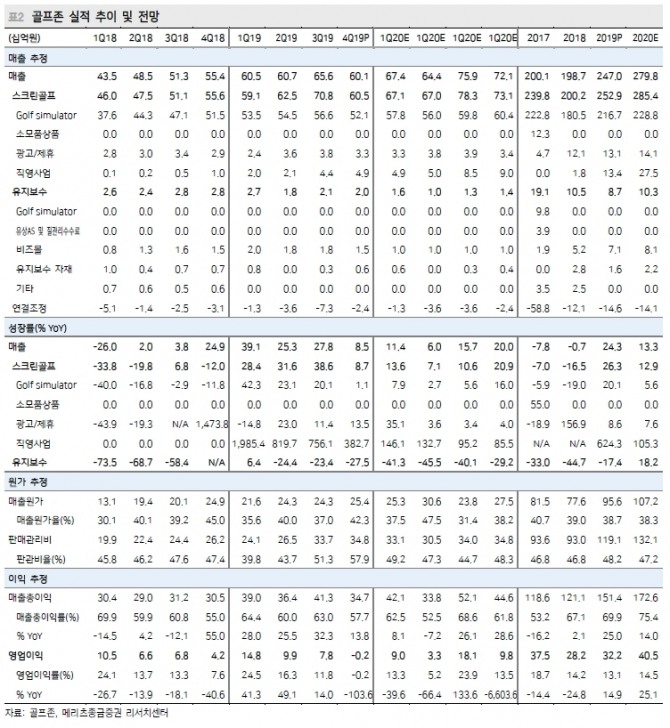 GDR(골프존 골프레슨 프로그램) 점당 평균 매출을 연 3억원으로 추정했으나 지난해 실제 2억 원에 미치지 못하며 적자를 키웠다. 동사는 예상보다 부진한 매출 성장 추이를 고려해 2019년 70개에 달했던 신규 출점을 2020년 4개로 대폭 축소한다는 계획이다. 기존 회원의 갱신 시기가 도래하는 2020년 2분기에 점당 손익분기점(BEP) 수준의 매출을 달성할 것으로 예상된다.