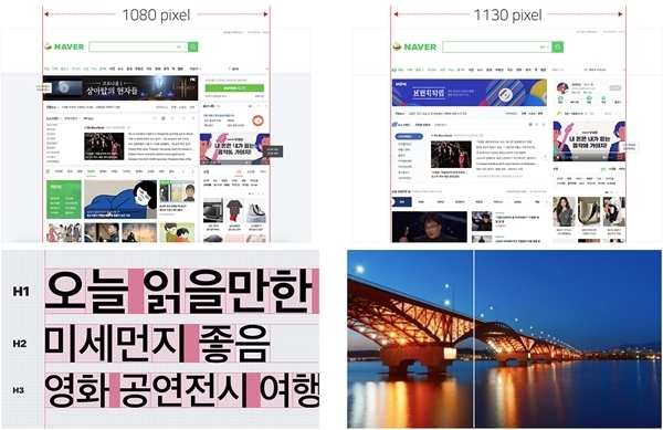 우선 네이버는 고해상도 기기의 보급이 보편화된 점을 고려해 더 커진 화면과 높아진 해상도에 맞게 네이버 메인 가로폭을 기존 1080픽셀에서 1130픽셀로 더 넓혀 제공하기로 했다. 고해상도 기기일수록 글자 크기가 작아보이는 점에 착안해 폰트 크기를 키우고 명도 대비도 더 뚜렷하게 개선한다.