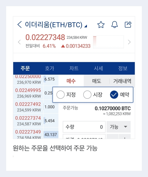 예약 주문은 특정 가상자산 가격이 사전 설정한 감시 가격에 도달하면 주문이 자동으로 실행되도록 한다. 투자자가 투자 목적과 시장 상황에 맞게 주문 조건을 사전에 설정해 놓을 수 있다. 특히 이익실현 및 손실제한 주문 설정 시 간편하게 활용할 수 있다고 회사는 강조했다.