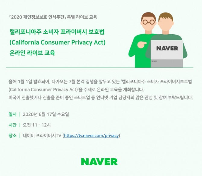 또한, 캠페인의 일환으로 6월 17일 수요일 오전 11시에는 '네이버 프라이버시TV'를 통해 ‘캘리포니아주 소비자 프라이버시보호법(California Consumer Privacy Act, 이하 CCPA)’을 주제로 온라인 라이브 교육을 실시한다.