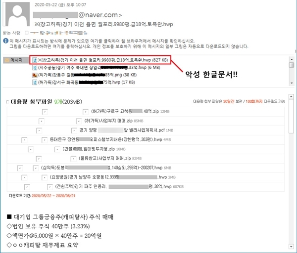 부동산 투자 관련 내용 담은 메일에 악성 문서파일과 다수의 정상 파일을 함께 첨부