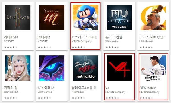 이미지 확대보기16일 구글 플레이스토어 게임 매출 순위에는 카트라이더 러쉬플러스가 3위, V4가 9위, 피파모바일이 10위에 각각 올라 있다. V4는 출시 7개월이 지난 시점에서도 10위권 내에 지속적으로 머무르며 장기 흥행작으로 자리매김한 상황이다. 여기에 지난달과 최근 출시한 모바일게임들도 흥행을 이어가고 있다.