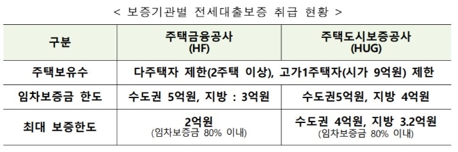 주택도시보증공사(HUG)의 전세대출 보증 한도도 축소된다. 앞으로는 HUG의 1주택자 대상 전세대출 보증 한도는 현행 수도권 4억 원, 지방 3억2000억 원으로 이원화했던 것을 전국 공통 2억 원으로 인하하기로 했다.