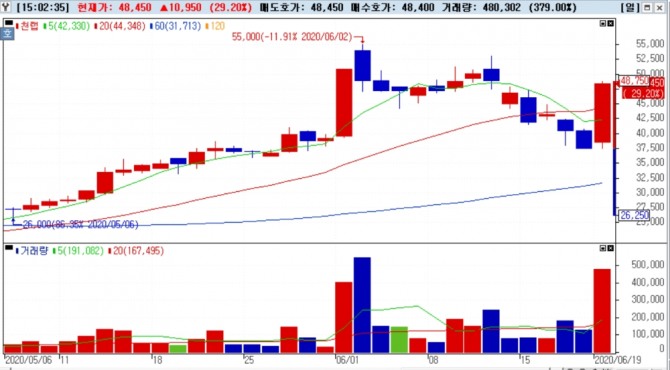 이미지 확대보기이날 오후 3시 11분 현재 천랩은 상한가인 4만8750원을 기록하고 있다.