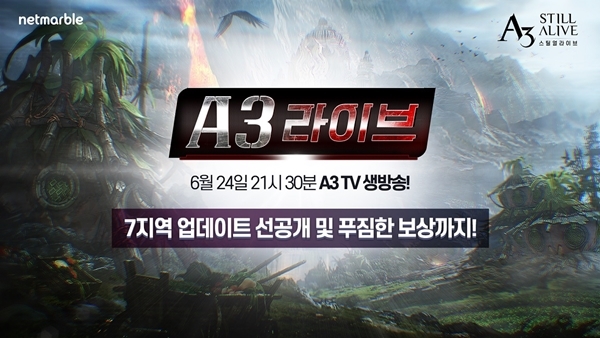 이 방송은 이날 오후 9시 30분 ‘A3: 스틸얼라이브’ 공식 유튜브 채널 A3 TV를 통해 생중계되며 게임해설가 정인호와 리포터 김효진이 출연한다.