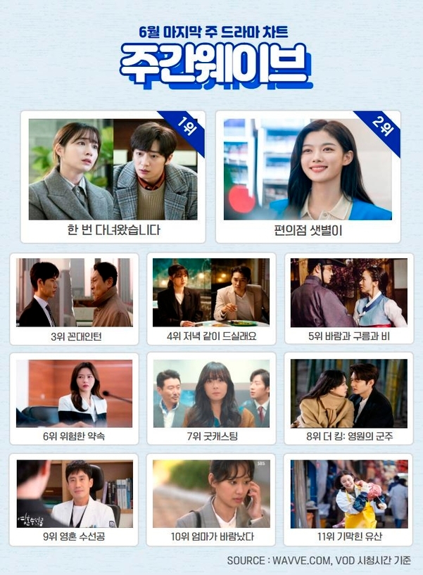 지난 주 5위를 차지했던 ‘편의점 샛별이’는 시청 시간이 115% 증가, 2위로 뛰어올렸다. 유쾌한 분위기와 특유의 감성이 인기다. 지난 방송에서는 최대현(주창욱)이 정샛별(김유정)에 대한 오해를 풀고 서로에 대한 한층 깊어진 감정을 교환하는 두 주인공의 모습이 그려졌다.