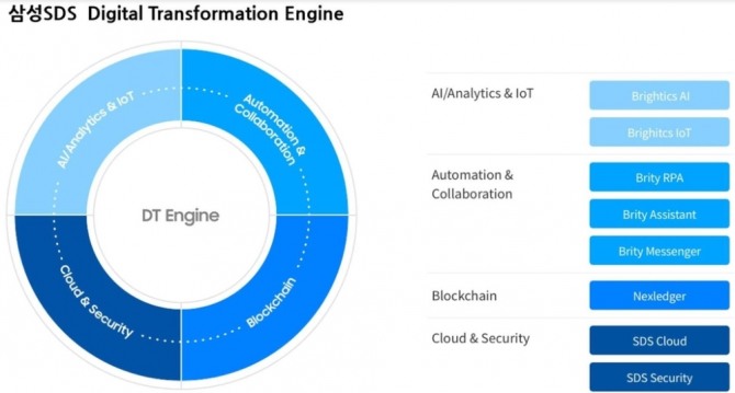마지막으로 클라우드 & 보안은 기업 업무 환경에 최적화된 하이브리드 클라우드 서비스 SDS 클라우드와 통합 보안 서비스 SDS 시큐리티로 구성된다.