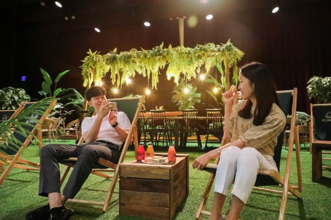 힐링카페에는 '리조트 존' '감성캠핑 존' '비디오 아트 존' 등 5개 주제의 휴식 공간이 마련돼있다. 카페 입구에서 '여름 사진'을 그려 인스타그램에 올리면 어린이용 음료와 생수를 받을 수 있다.