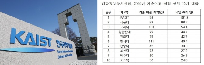 대학정보공시센터에 따르면 KAIST는 작년 한 해 동안 56건의 기술이전 계약을 통해 총 101억 8300만 원의 기술이전료 수입을 달성했다. KAIST에 이어 서울대와 고려대가 각각 88억 원과 54억 원의 기술이전료 수입을 올리며 2위와 3위를 차지했다.