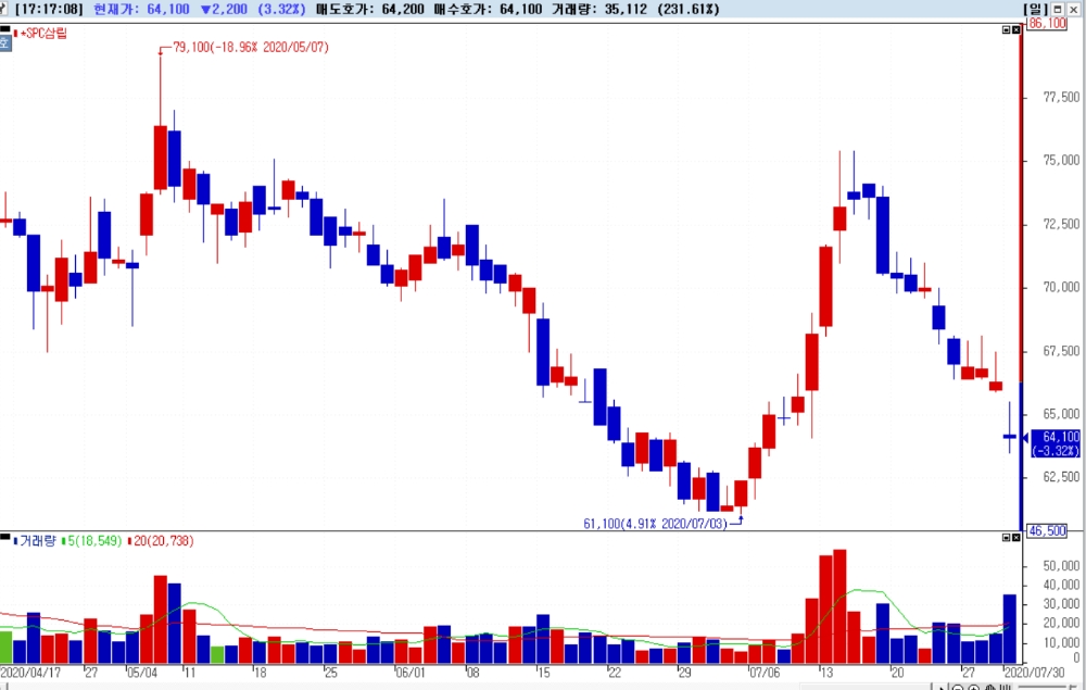 이미지 확대보기이날 SPC삼립은 3.32% 하락한 6만4100원에 장을 마감했다. 시초가 부터 3.17% 하락한 6만4200원으로 장을 시작하는 등 분위기가 좋지 않았다.