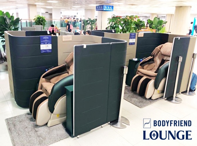 제주공항 바디프랜드 라운지는 국내선 격리대합실 2층 동편(교통약자 라운지 측면)과 일반대합실 3층(3번 게이트 측면)에 위치했다. 위생 관리를 고려해 다리 안마부가 오픈형으로 제작된 무인 안마의자 서비스 전용 모델 제품 8대가 설치됐다.