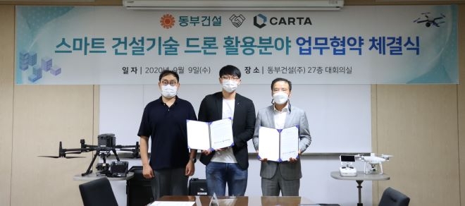 동부건설은 9일 드론 오픈 플랫폼 시스템 도입을 위해드론 스타트업 ‘카르타’와 업무협약(MOU)을 체결했다고 밝혔다. 드론 오픈 플랫폼은 사내 임직원 누구나 드론 정보를 활용할 수 있도록 드론 데이터를 공유할 수 있는 시스템이다.