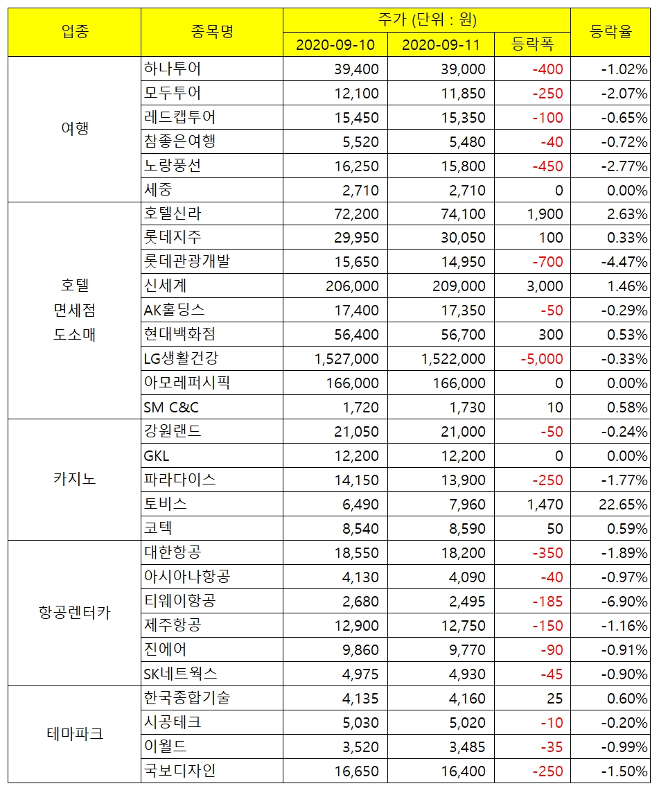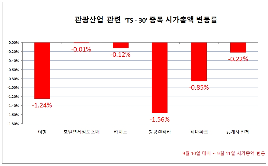 전 업종에 걸쳐 하락세를 보이고 있으며, 여행업이 -1.24%, 호텔/면세점/도소매업 -0.01%, 카지노업은 -0.12%, 항공렌터카업은 -1.56%, 테마파크 관련 -0.85% 의 하락율을 각각 기록하고 있다.