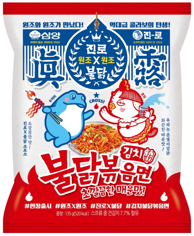 패키지에는 진로와 협업한 한정판 디자인을 적용했다. 라면 원조와 소주 원조의 만남을 뉴트로 콘셉트로 표현해 각 사의 과거 로고를 활용했다. 전면에는 불닭 캐릭터 '호치'와 진로 캐릭터 '두꺼비'를 배치해 재미를 더했다. 한정판 패키지는 오는 10월까지만 생산된다.