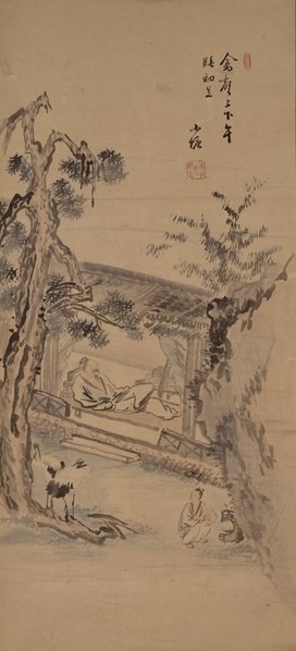 화가는 글 내용을 그림으로 충실하게 옮겼다. 언덕 위엔 장송(長松) 세 그루가 푸른빛을 뿜으며 위용을 뽐내고, 언덕 아래 널찍한 마당 한쪽엔 햇빛 가리개를 처마에 덧댄 초옥 한 채가 단아하게 자리했다. 한 칸짜리 넓은 문이 달린 방에는 선비 홀로 베개 베고 다리 꼰 채로 낮잠에 빠져 있다.