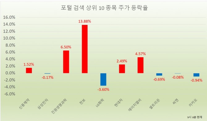 표기 순서는 포털사 기준 검색 상위 랭킹, 종목명, 현재가, 주가 등락률 순이다.