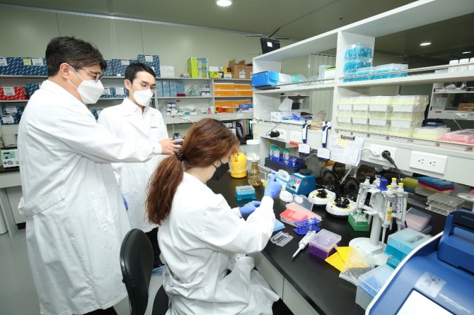KT와 엔젠바이오 관계자가 엔젠바이오 연구소를 찾아 설명을 듣고 있다. 사진=KT이미지 확대보기