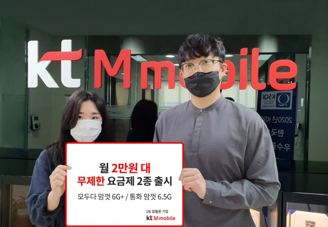 KT엠모바일은 월 2만원대에 음성, 문자, 데이터를 무제한으로 쓰는 '모두다 맘껏 6G+'와 데이터 6.5GB에 음성, 문자를 기본으로 제공하는 '통화 맘껏 6.5G' 요금제 2종을 출시한다고 25일 밝혔다.