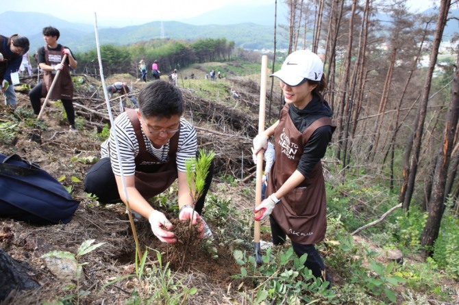 AK플라자 임직원들이 강원도 강릉시의 한 야산에 애경 숲 1호를 조성하는 모습. 사진=AK플라자