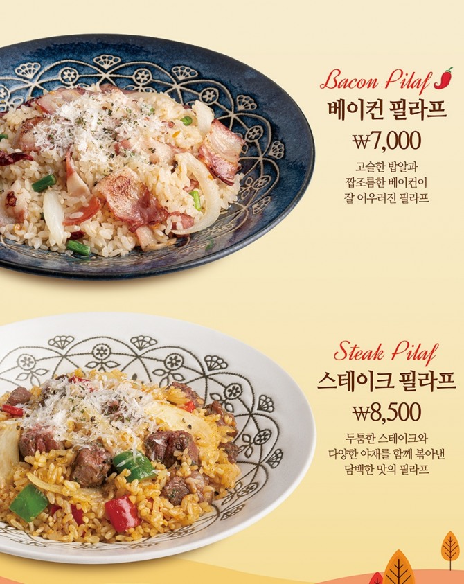 베이컨 필라프는 버터갈릭볶음밥에 짭조름한 베이컨과 알싸한 사천 고추를 살짝 첨가해 고소한 풍미를 느낄 수 있다. 스테이크 필라프는 버터갈릭볶음밥에 두툼하고 육즙 가득한 부채살 스테이크와 다양한 채소를 함께 볶아내 다채로운 맛을 선사한다.