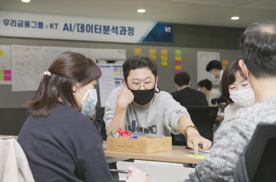 'KT x 우리금융그룹 AI/데이터분석 과정'에 참석한 우리금융그룹 직원들이 KT의 대표적인 혁신 프로그램인 '1등 워크숍'을 통해 실무에 적용할 수 있는 '우리만의 AI 과제'를 발굴하고 있다. 사진=KT