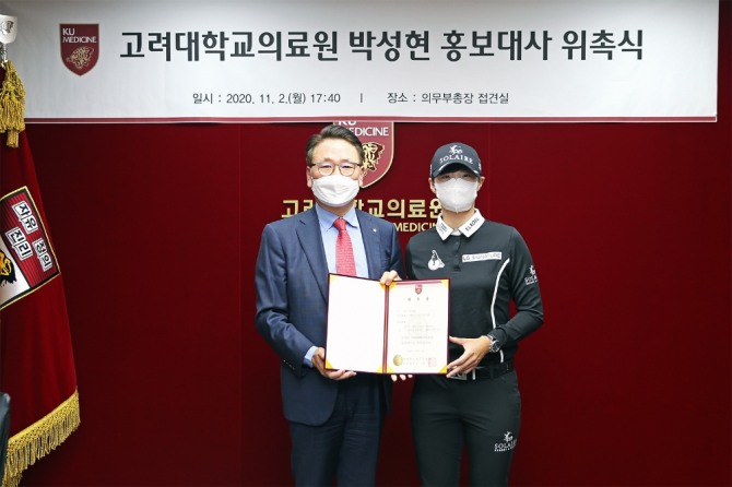 행사는 고려대 의과대학 본관 3층 접견실에서 이뤄졌으며, 김영훈 의무부총장과 박종훈 안암병원장 등 고려대의료원 주요 보직자와 박성현 프로골퍼, 소속사인 세마스포츠마케팅의 이성환 대표를 비롯한 관계자들이 함께한 가운데 진행됐다.