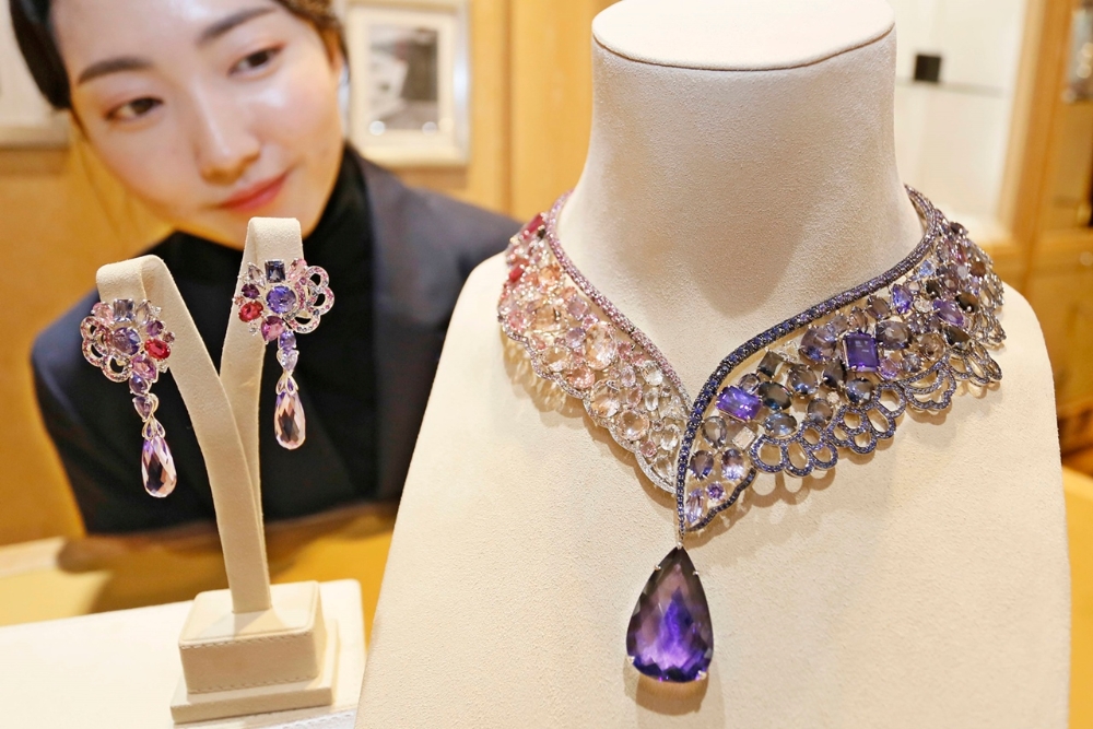 해당 목걸이는 탄자나이트와 1000개 이상의 사파이어, 다이아몬드, 루비 등이 최상의 기술력으로 세팅돼 정교한 실루엣과 곡선이 조화를 이루는 것이 특징이다. 가격은 목걸이 12억 원대, 귀걸이 1억 원대이다.