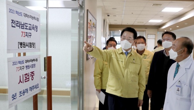 김 지사는 “코로나 발생 후 첫 수능시험으로 전남에서 1만 4천여 명이 시험을 치르고 확진자는 더욱 어려운 여건 속에서 시험을 치러야해 편안한 마음으로 실력을 발휘할 수 있도록 최선을 다해 준비해야 한다”며 “미래세대인 고등학교 3학년 학생들이 안전하게 시험을 치를 수 있도록 시험장 방역에 힘 써 줄 것”을 당부했다.