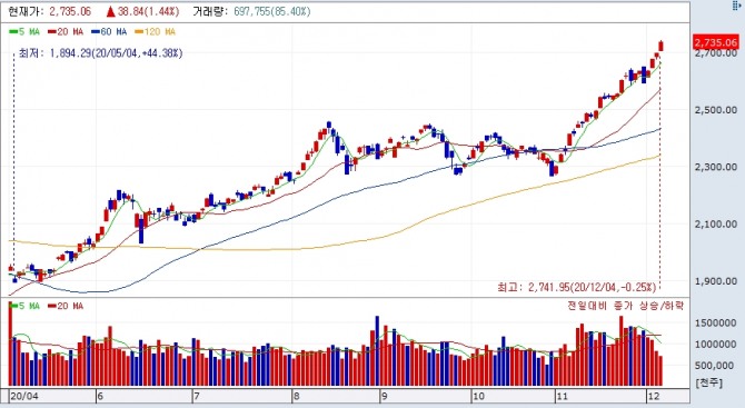 이미지 확대보기코스피가 2730선을 넘어서며 연일 강세장을 연출하고 있다.