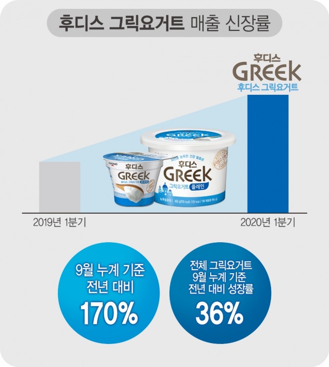 국내 최초로 그릭요거트를 선보인 일동후디스는 대용량 제품인 ‘후디스 그릭요거트(450g)’ 의 매출이 9월 누계 기준으로 전년 대비 170% 성장했다. 그릭요거트 전체는 9월 누계 기준으로 전년 대비 36% 성장을 기록하는 등 상대적으로 대용량 그릭요거트의 판매가 이례적으로 높은 상황이다.