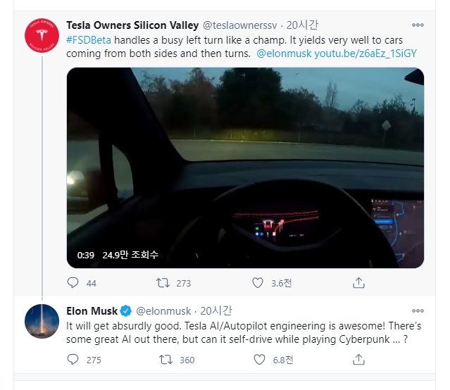 사용후기 영상을 올린 테슬라 마니아는 “(운전대에서 손을 뗐음에도) FSD가 매우 성공적으로 좌회전을 했다”면서 “서로 다른 방향에서 오는 차들에 대한 양보를 잘 한 뒤에 좌회전을 했다”며 높은 만족감을 표시했다.