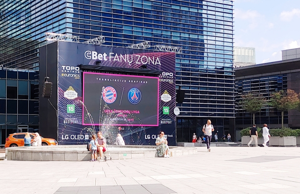 LG전자가 동유럽 리투아니아 수도 빌니우스시(市) 비즈니스센터 광장에 설치한 대형 스크린에 '올레드 TV' 옥외광고를 하고 있다. 사진=LG전자