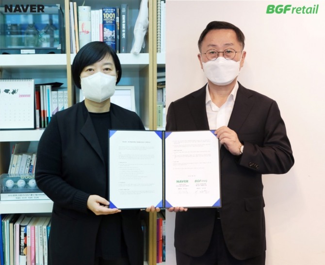 협약식에느 한성숙 네이버 대표와 이건준 BGF리테일 대표 등 양사 주요 관계자들이 참석했으며, 네이버의 업무용 협업 도구 ‘네이버웍스’를 통해 비대면으로 진행됐다.
