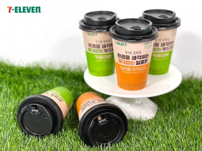 세븐일레븐은 지난 26일 유가공식품 전문업체 ‘서울F&B’와 함께 빨대를 사용하지 않아도 편리하게 마실 수 있는 친환경 아이디어 상품 ‘빨대없는 컵커피’ 2종(카페라테‧캐러멜마키아토)을 출시했다.