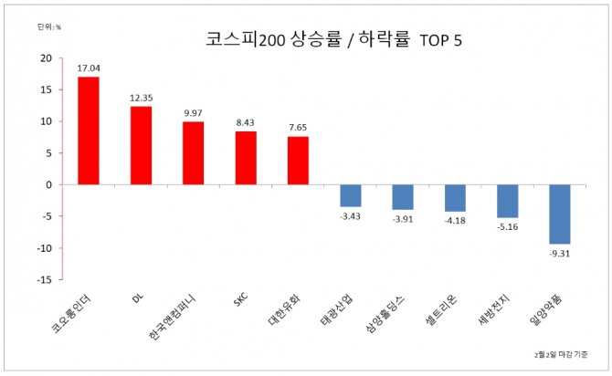 코오롱인더 4만9100원 +7150 (17.04%), DL 7만2800원 +8000 (12.35%), 한국앤컴퍼니 1만8200원 +1650 (9.97%), SKC 13만5000원 +10500 (8.43%), 대한유화 30만9500원 +22000 (7.65%), 빅히트 23만2500원 +15000 (6.9%), 일진머티리얼 7만5500원 +4800 (6.79%), 쿠쿠홀딩스 10만5000원 +6300 (6.38%), 롯데칠성 12만6000원 +7500 (6.33%)