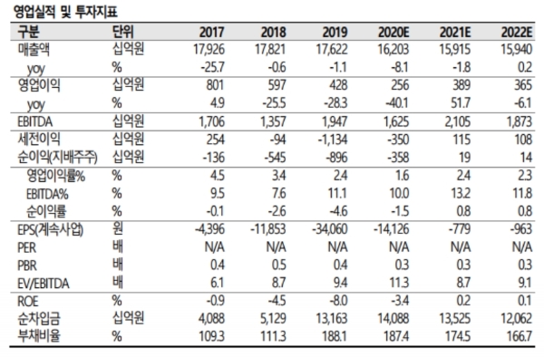 주영훈 유진투자증권 연구원도 "그동안 진행된 구조조정 작업의 효과가 본격나타나는 시점이다”며 “상반기 실적도 전년 동기의 낮은 기저 (2020년 1분기 521억 원, 2분기 14억원)를 감안했을 때 영업이익 증가가 가능할 것으로 기대돼 실적에 대한 우려는 크지 않다”고 지적했다.