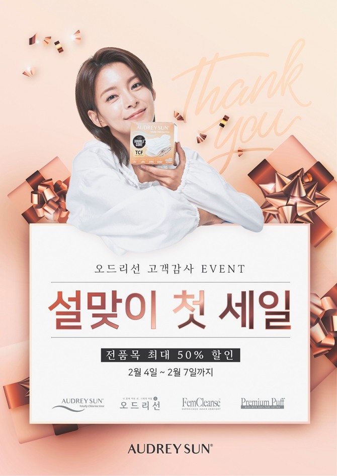 친환경 여성용품 브랜드 오드리선이 네이버 스토어팜에서 오는 7일까지 설맞이 감사세일을 벌인다. 생리대를 비롯해 여성청결제, 화장솜 등을 최대 50% 할인가에 판매하고, 추가 할인과 일러스트 에코백 등 다양한 혜택을 제공한다.