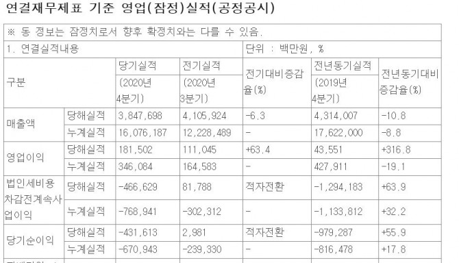 지난해 4분기 매출은 약 3조 8477억 원으로 2019년 4분기 대비 10.8% 감소했지만, 영업이익은 약 1815억 원으로 같은 기간 316.8% 증가했다.
